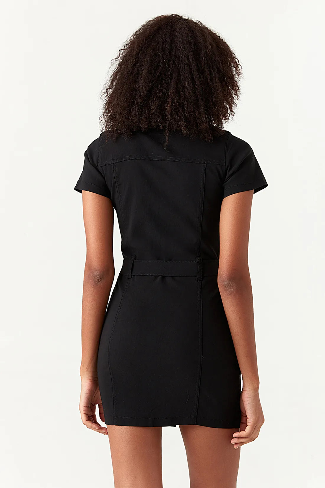 The Black Casual Bengaline Dress is a sleek take on everyday utility style. Designed in a structured stretch fabric, it features a shirt collar, short sleeves and zip-through front for a modern, functional finish. Patch pockets and a belted waist define the silhouette, while the mini length keeps it fresh and flattering. Pair with trainers or chunky sandals for an effortless casual look.