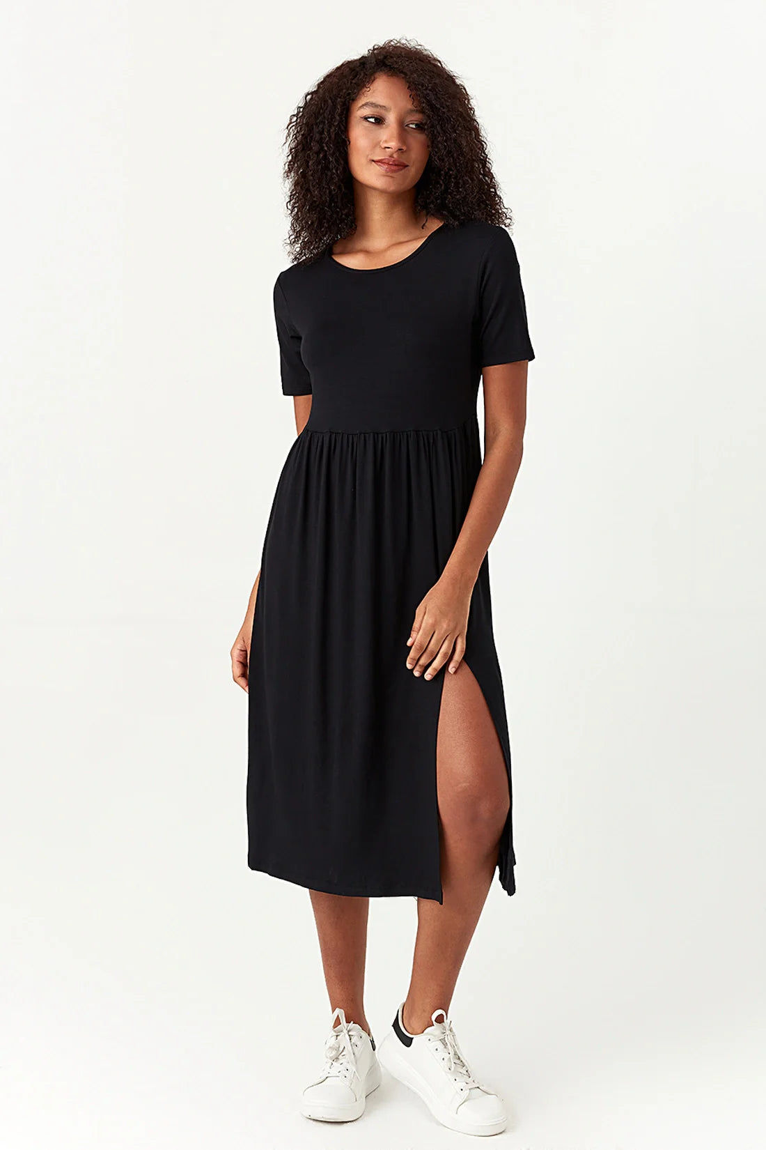 Keep it cool and effortless with our Black Side Split T-Shirt Dress. The ultimate throw-on-and-go piece for laid-back days. Made from soft, breathable fabric, this casual black dress features a relaxed fit, short sleeves, and a sleek side split that adds a subtle edge to your everyday style. Its minimalist design makes it incredibly versatile. Wear it with trainers for a casual street-style vibe, or layer it over cycling shorts or leggings for an off-duty look. Whether you’re running errands, heading to brunch, or lounging at home, this black midi dress is your new go-to for comfort and style. The simple silhouette, split hem, and lightweight feel make it ideal for warm weather, layering, or transitional styling all year round.
