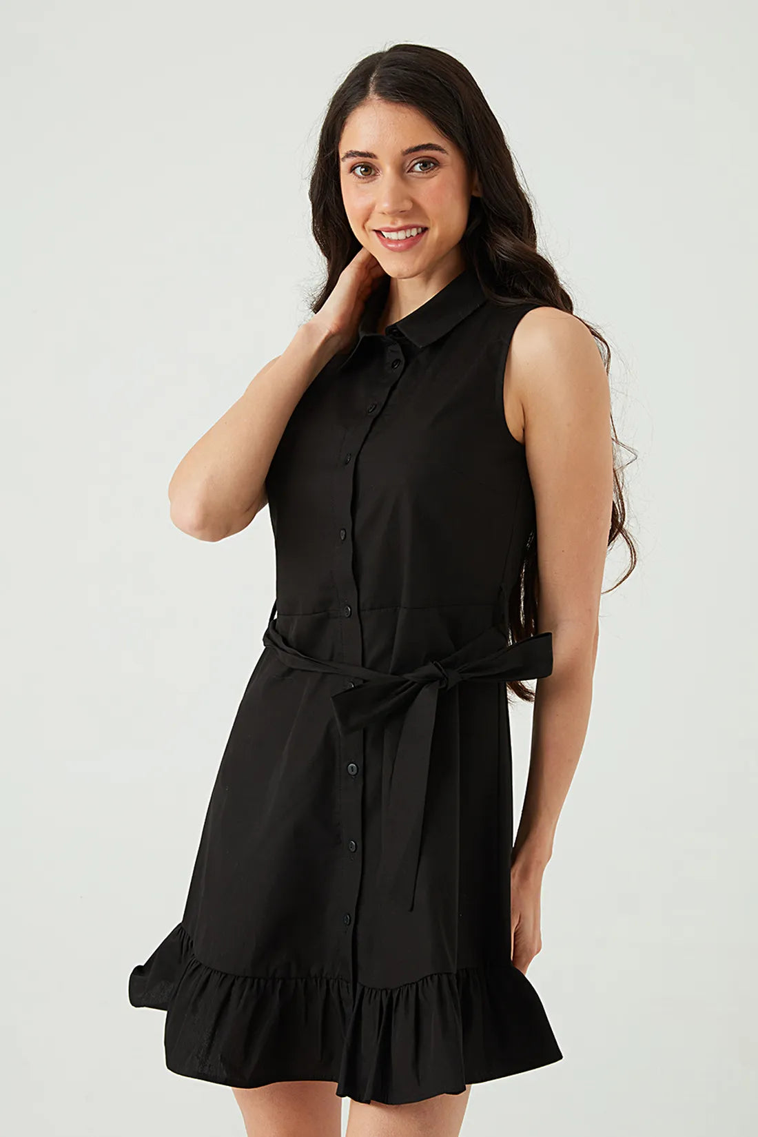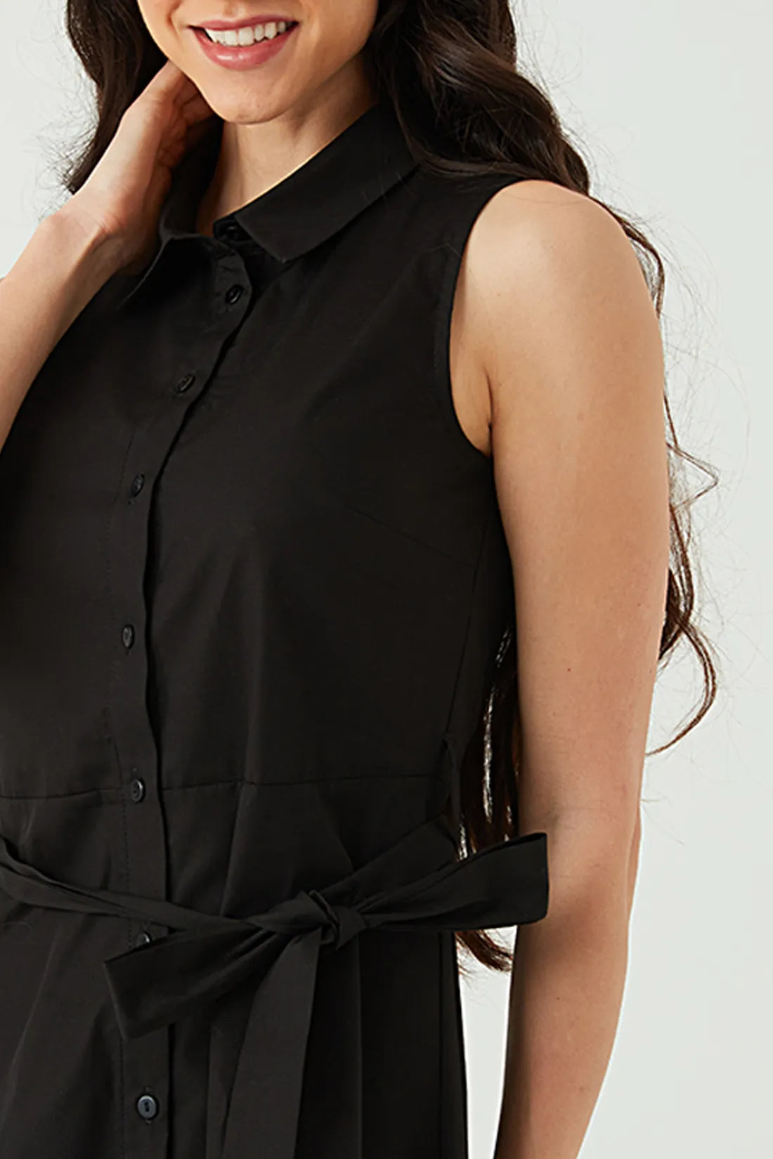 The Black Sleeveless Poplin Shirt Dress is your go-to piece for easy polish with minimal effort. Made from crisp, breathable poplin, this sleeveless shirt dress features a button-through front and a matching self belt that cinches the waist for a flattering shape. Whether you're heading to brunch or dressing for a casual day at work, this black dress delivers a relaxed yet put-together vibe.