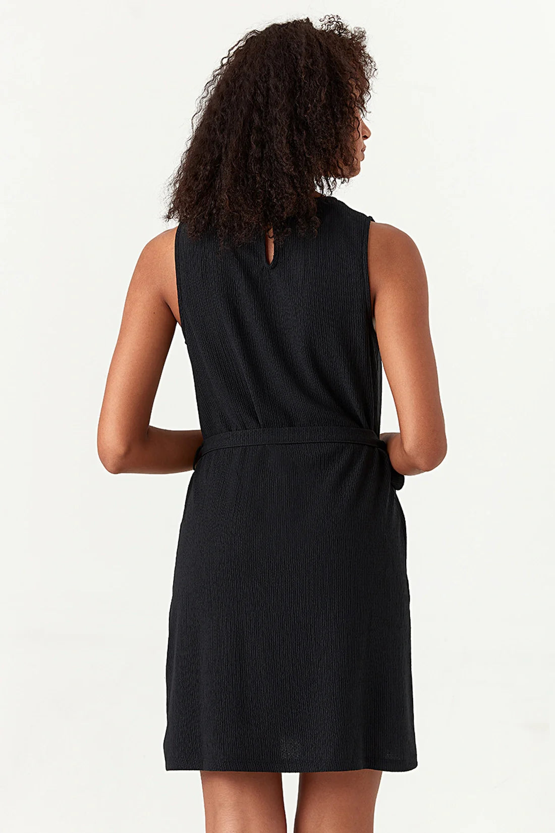 The Black Textured Belted Sleeveless Dress is your throw-on-and-go solution for warm days and casual plans. Made from soft textured jersey fabric, this sleeveless style features a round neckline and an adjustable fabric belt to cinch the waist. The relaxed silhouette makes it perfect for daywear, yet easy to dress up with sandals or gold accessories for an effortless evening vibe.