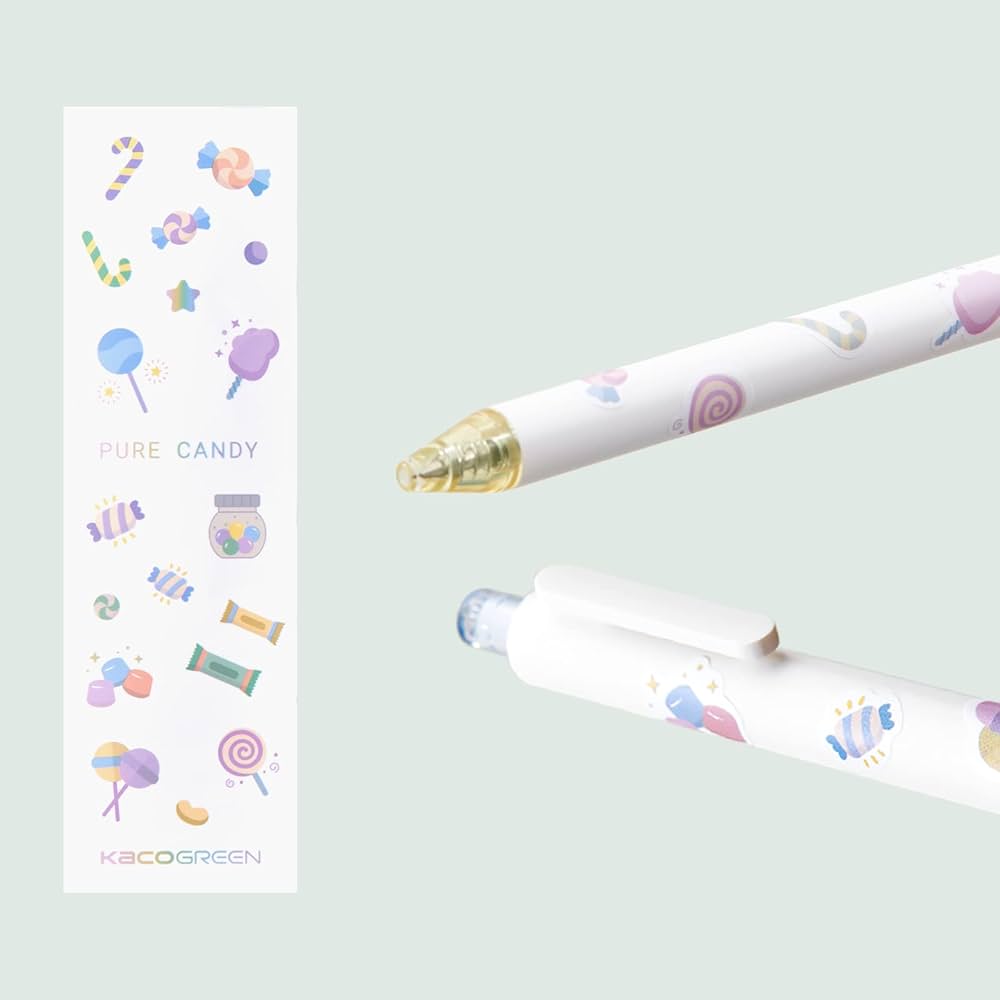 Each set features 5 black ink gel pens, with plain white bodies & pastel tips & nibs, & a candy themed sticker sheet that you can use to decorate your pens.