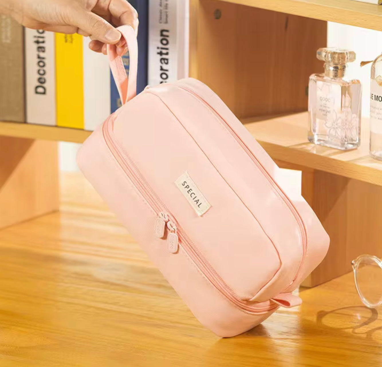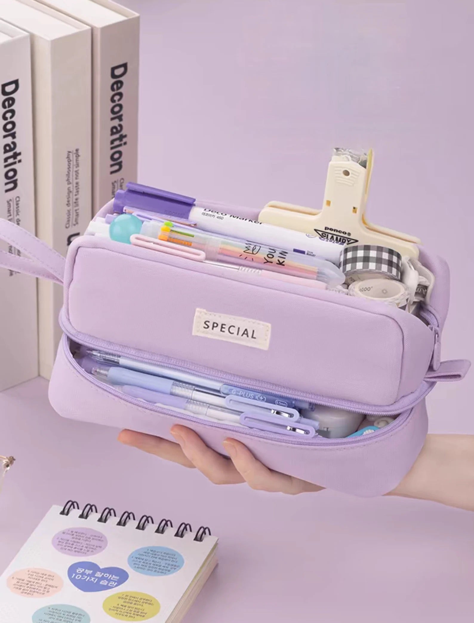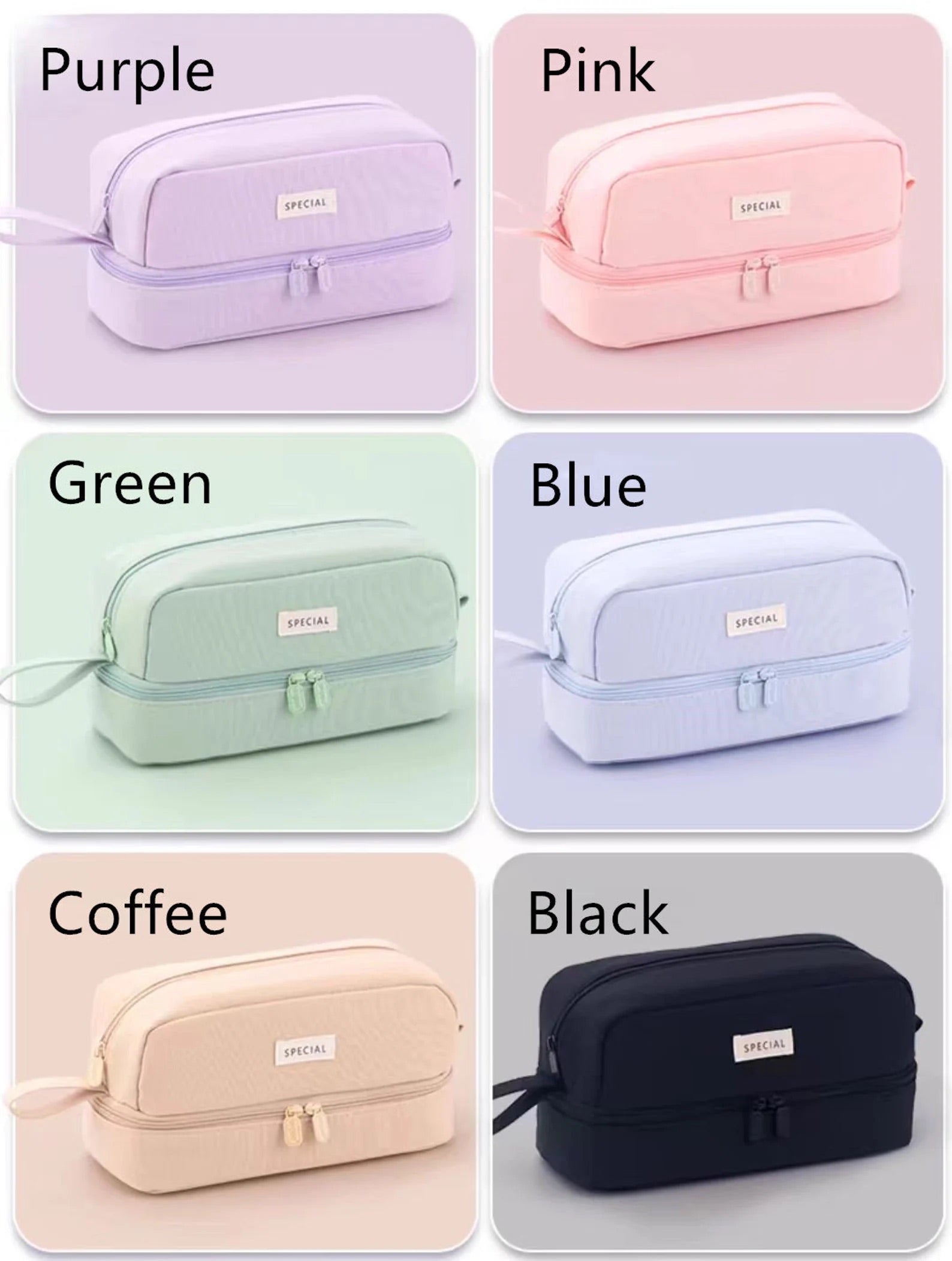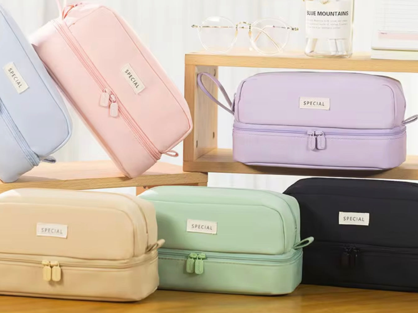 Each one features a standard zipper pocket at the top, but also has a bottom compartment that opens up to reveal another layer with a pen organisation section and more storage space.