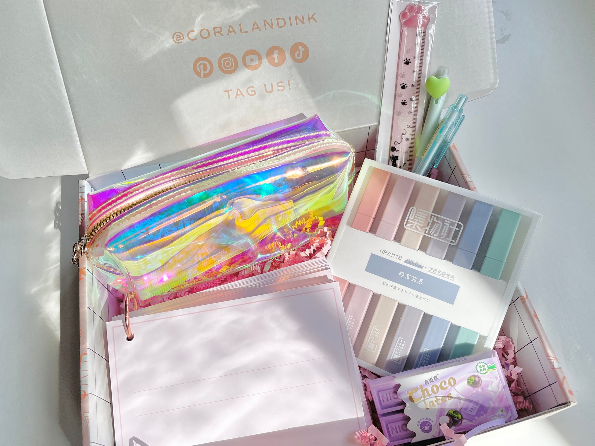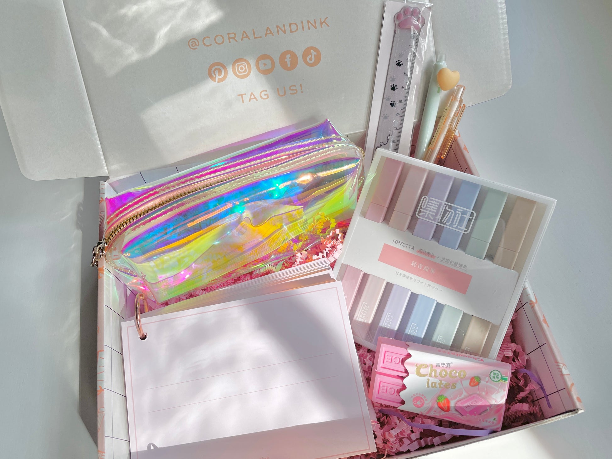 Each box contains: - Clear holographic pencil case - Set of 6 muted pastel highlighters - Chocolate eraser - cat paw ruler - set of 50 pink aesthetic revision cards (comes with a gold binder ring for easy use) - Mechanical pencil - Erasable heart gel pen