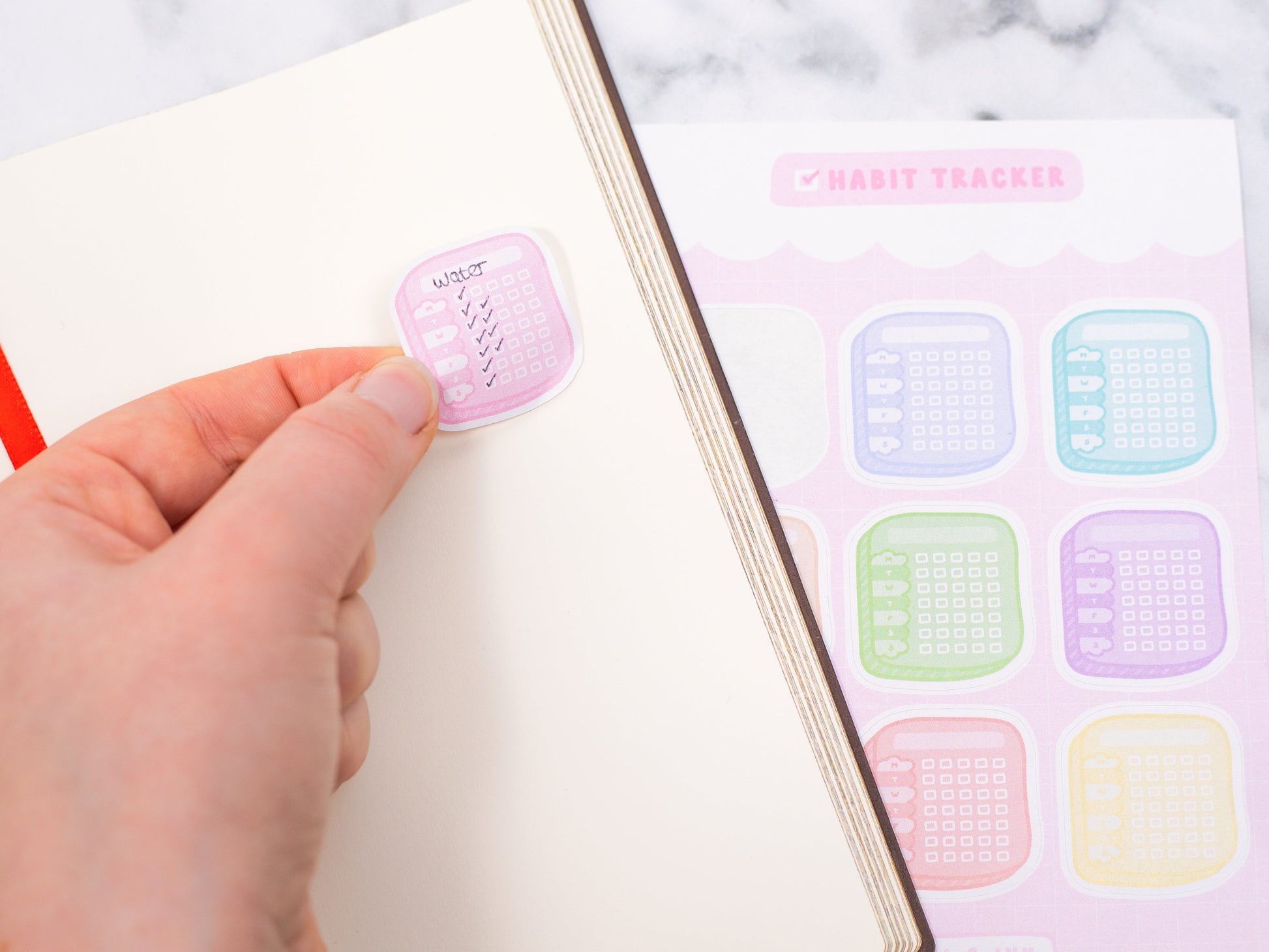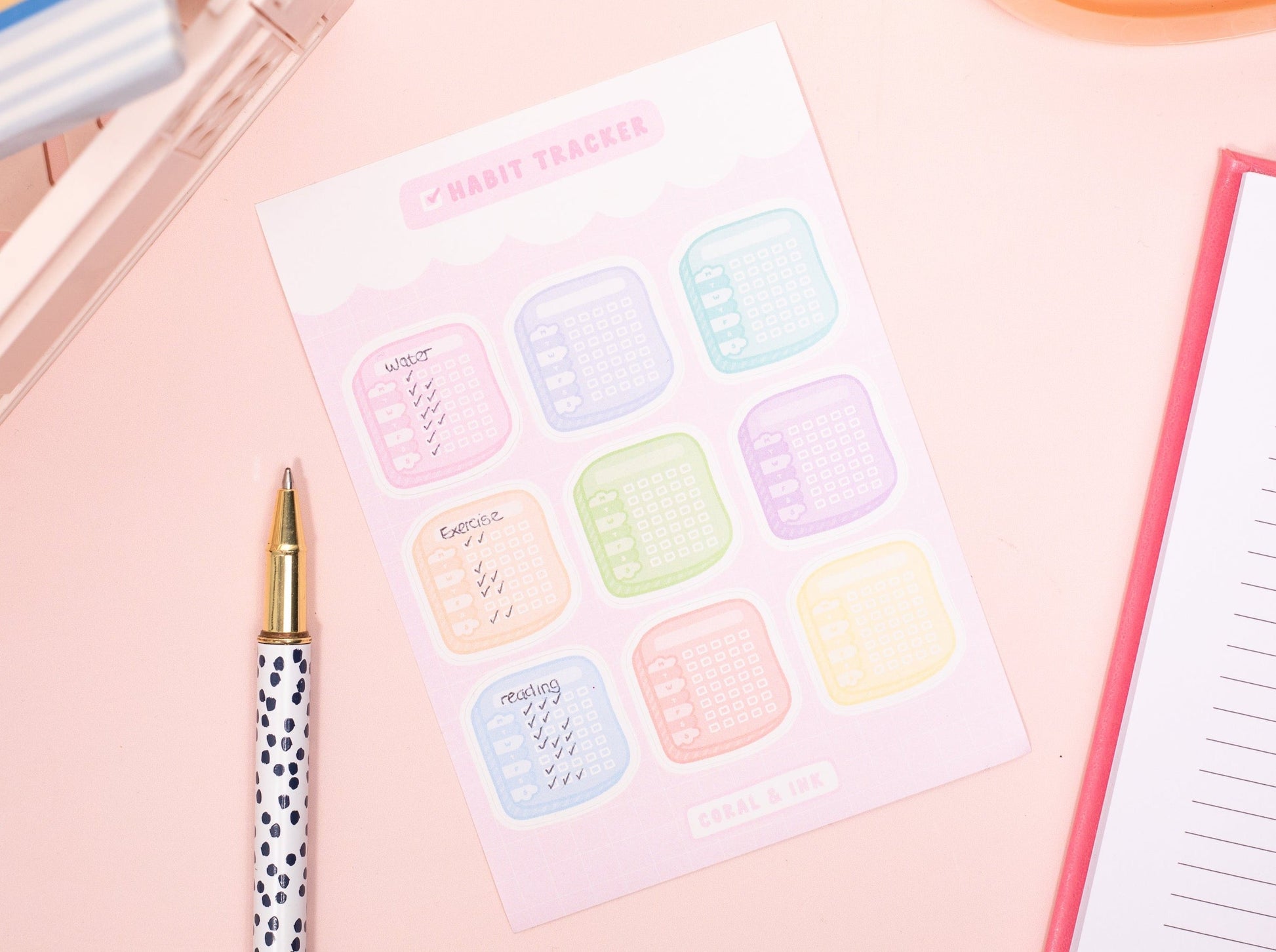 The sheets are printed on a matte sticker paper, instead of our regular glossy material, and so you are able to write on the stickers and track all your habits.