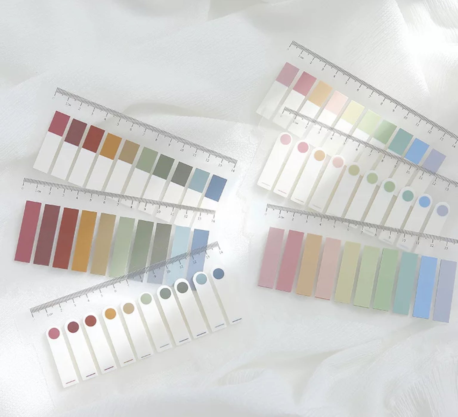 Sticky tab sets that all come attached to a ruler with holes to insert inside your planner or notebooks.