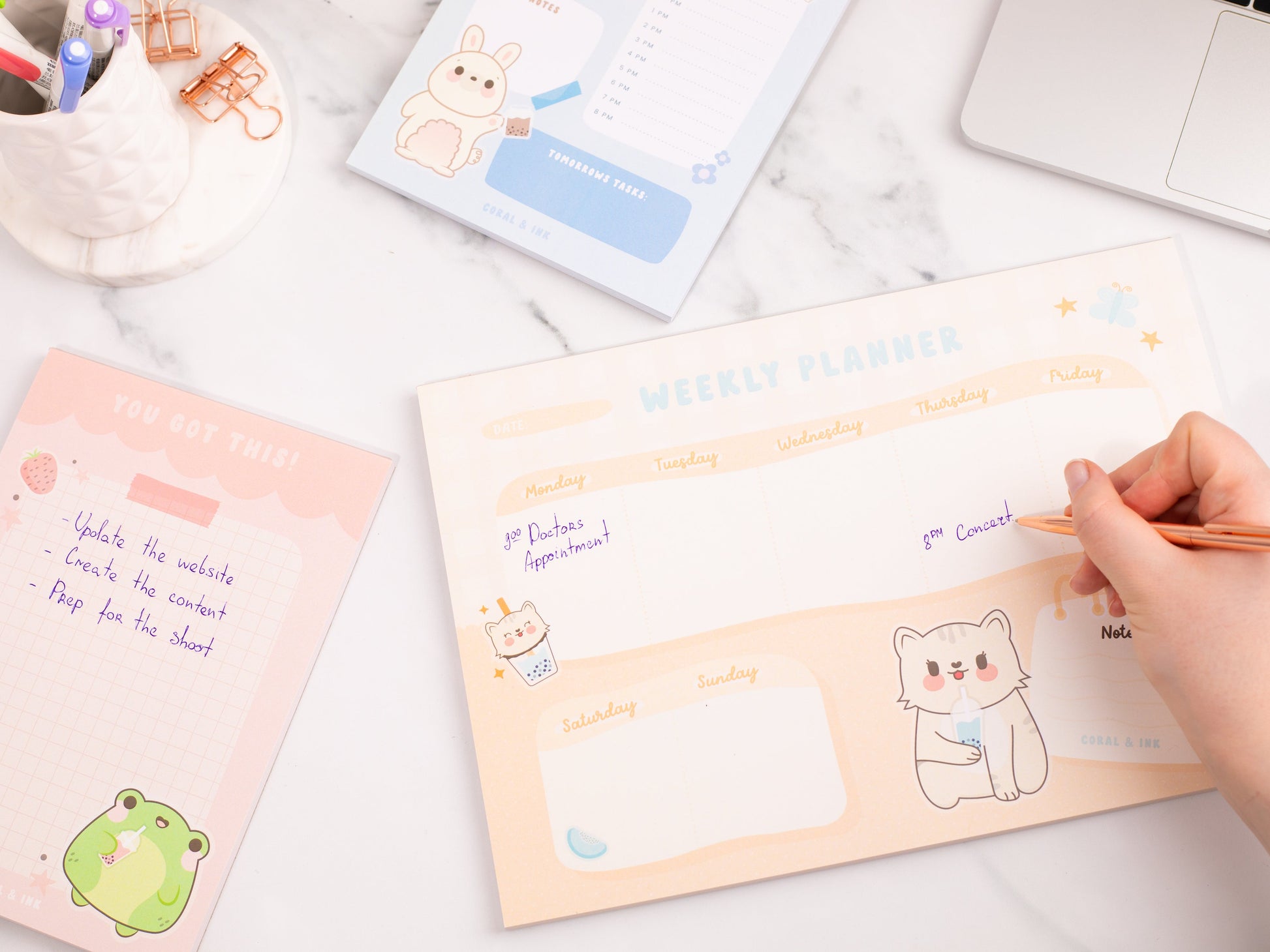 - A4 blue boba cat weekly planner (features blocks for each day of the week, a place to write the date for the week beginning, as well as a little notepad to write down any extra notes as well as tasks for next week)