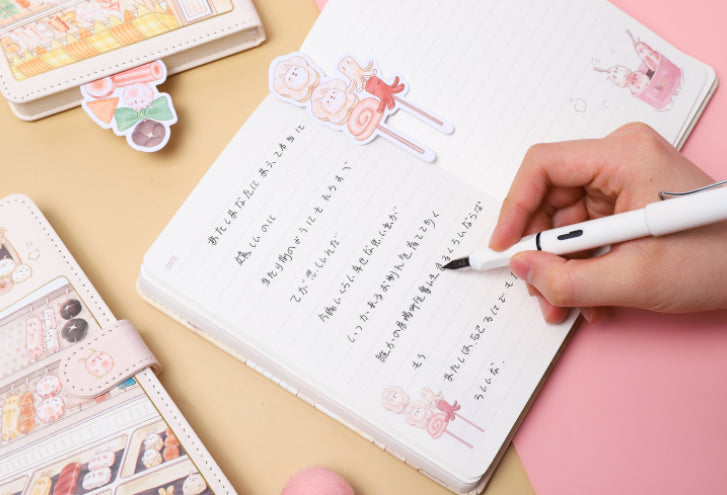 The inner pages are lined and all feature cute drawings of sushi bunnies at the bottom of each page.