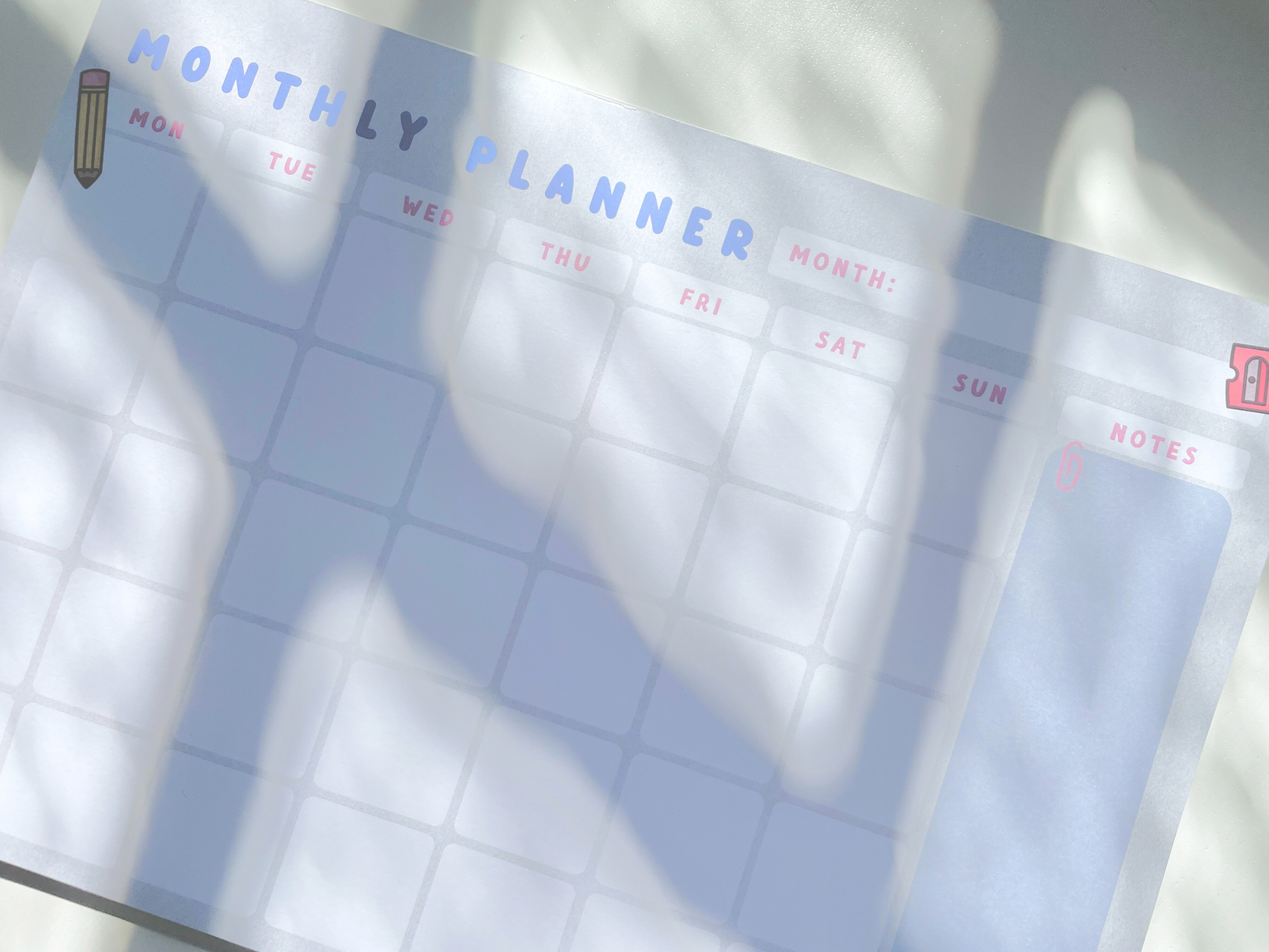 Monthly A4 Desk Planner: Features an undated monthly spread, space to add the month and a handy notes section, all surrounded by cute stationery illustrations.