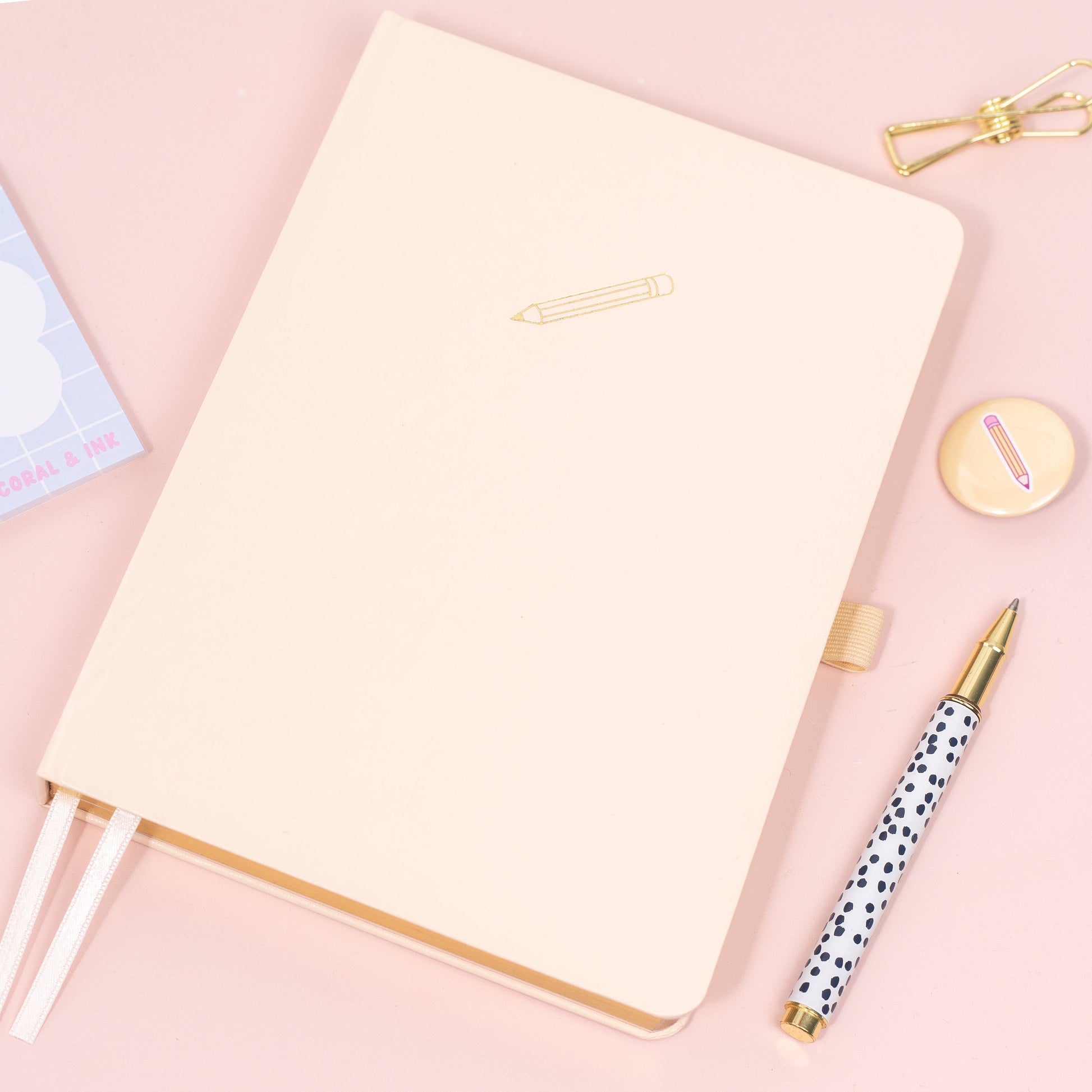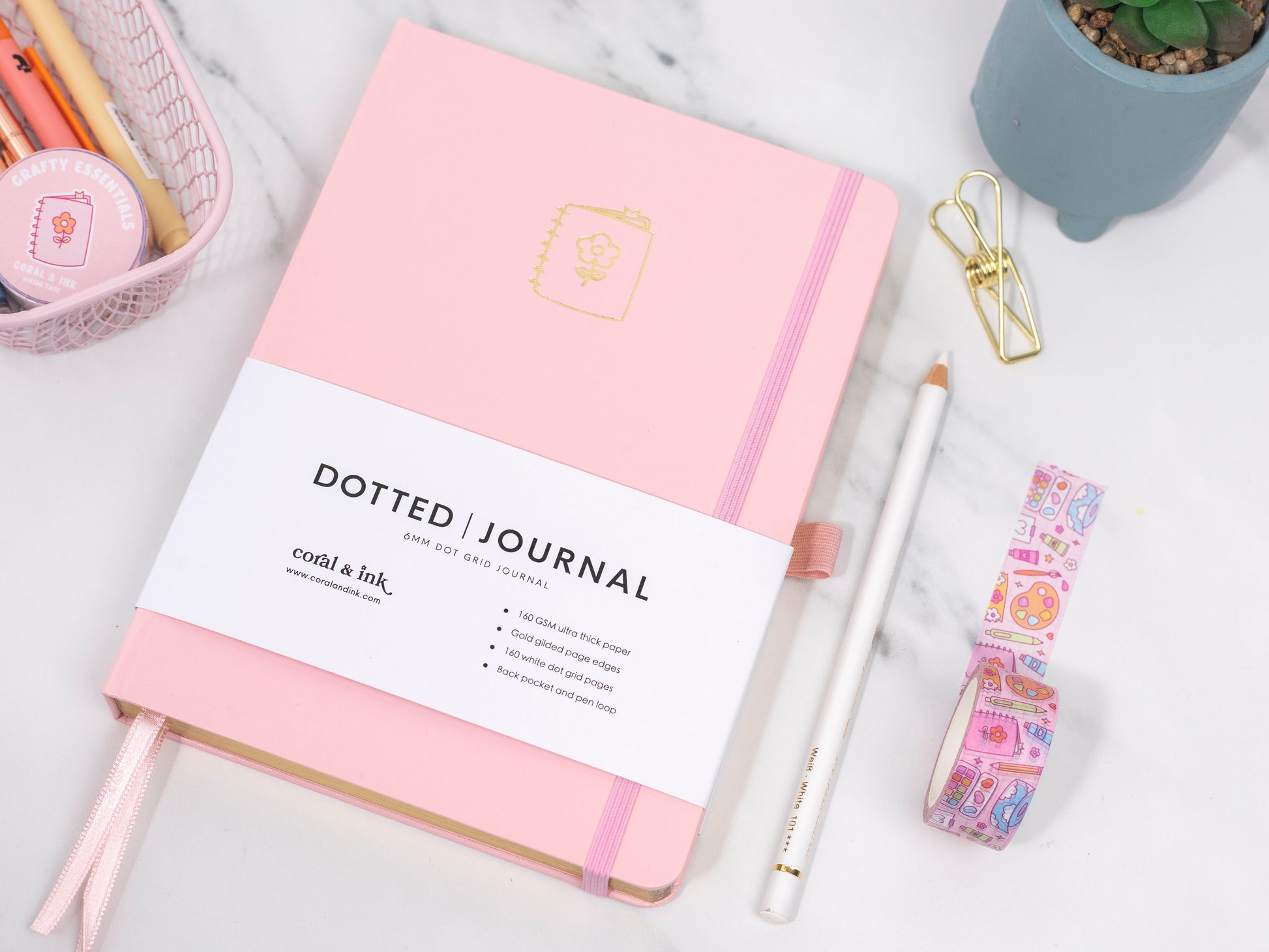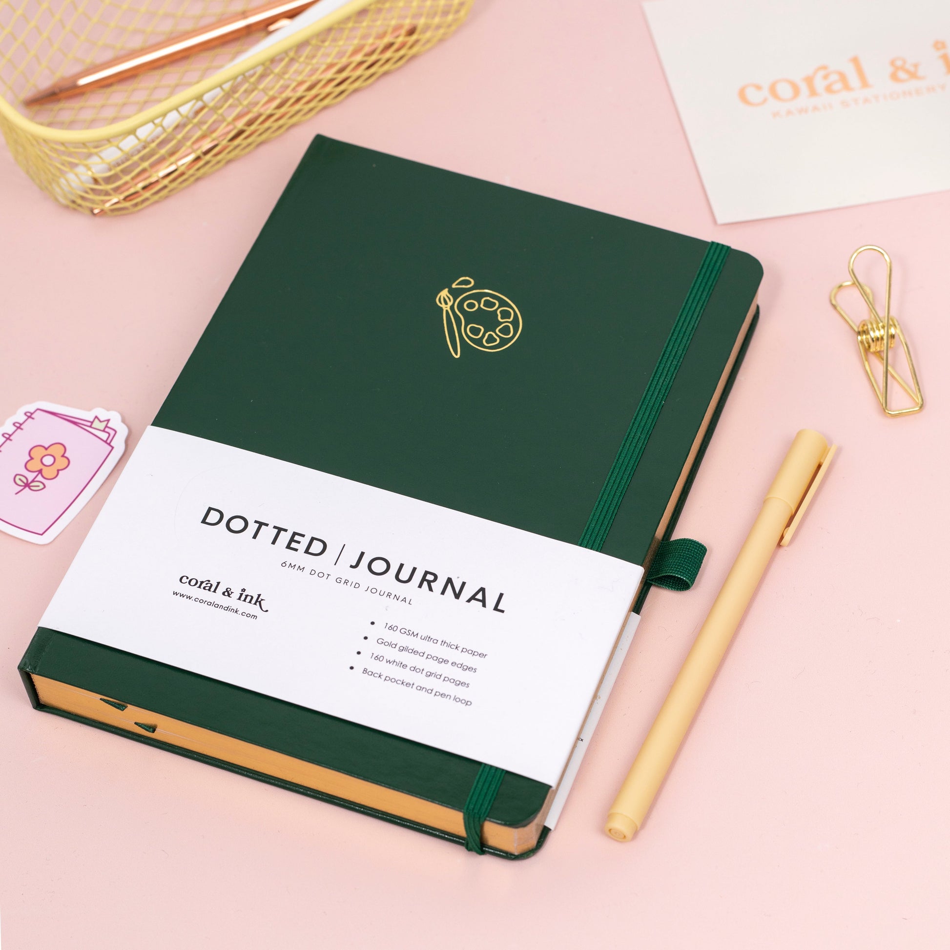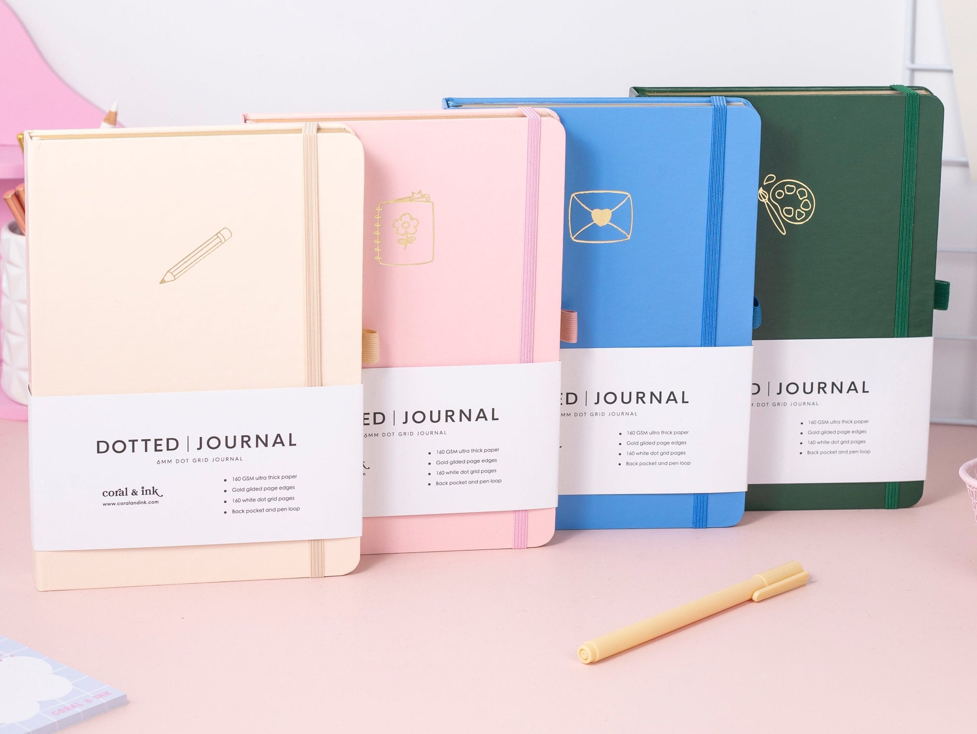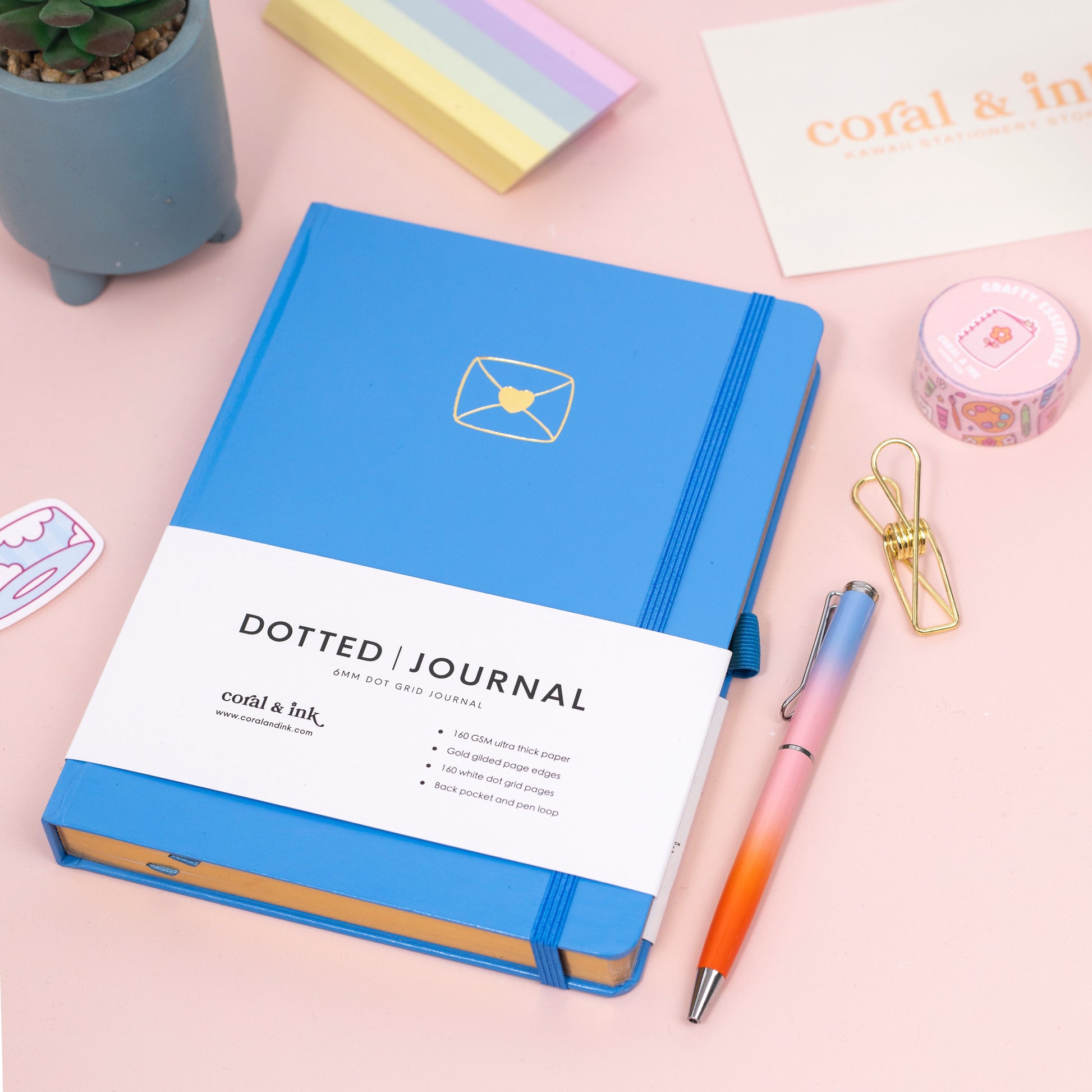 Features include a matching colour elastic closure band, pen loop, 2 pastel ribbon bookmarks, gold gilded page edges and a back envelope to store all your stickers and journaling must haves, also lays flat at 180 degrees for ease of use.